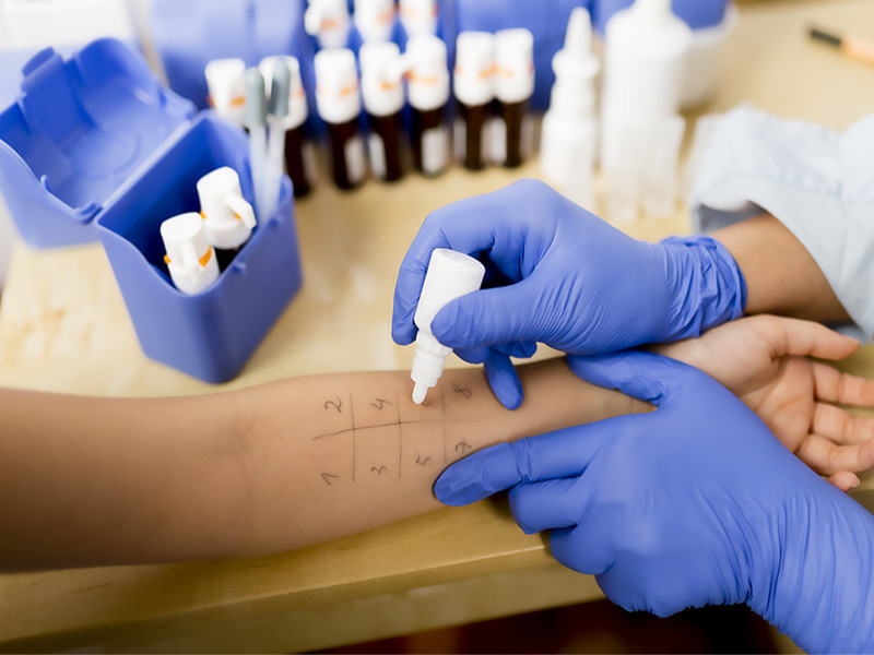 Um herauszufinden, gegen was man eigentlich allergisch ist, können wir in der Arztpraxis einen Allergietest durchführen. Dies erfolgt mittels Bluttest oder durch den sog. Prick-Test. Dabei werden verschiedene Allergene auf die Haut gebracht, die vorher oberflächlich minimal angeritzt wurde. Rötet sich die Haut nun an den entsprechenden Stellen oder treten sogar Quaddeln auf, dann besteht eine Allergie gegen das spezifische Allergen. Keine Angst, der Prick-Test ist kaum schmerzhaft und wird normalerweise auch sehr gut vertragen.